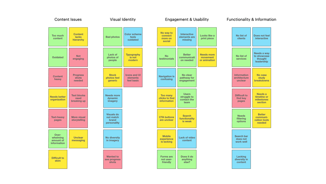Instead of just listing out problems, we needed a structured way to prioritize what mattered most. That’s where our Affinity Map → Trends & Patterns → Priority Matrix process came in:
